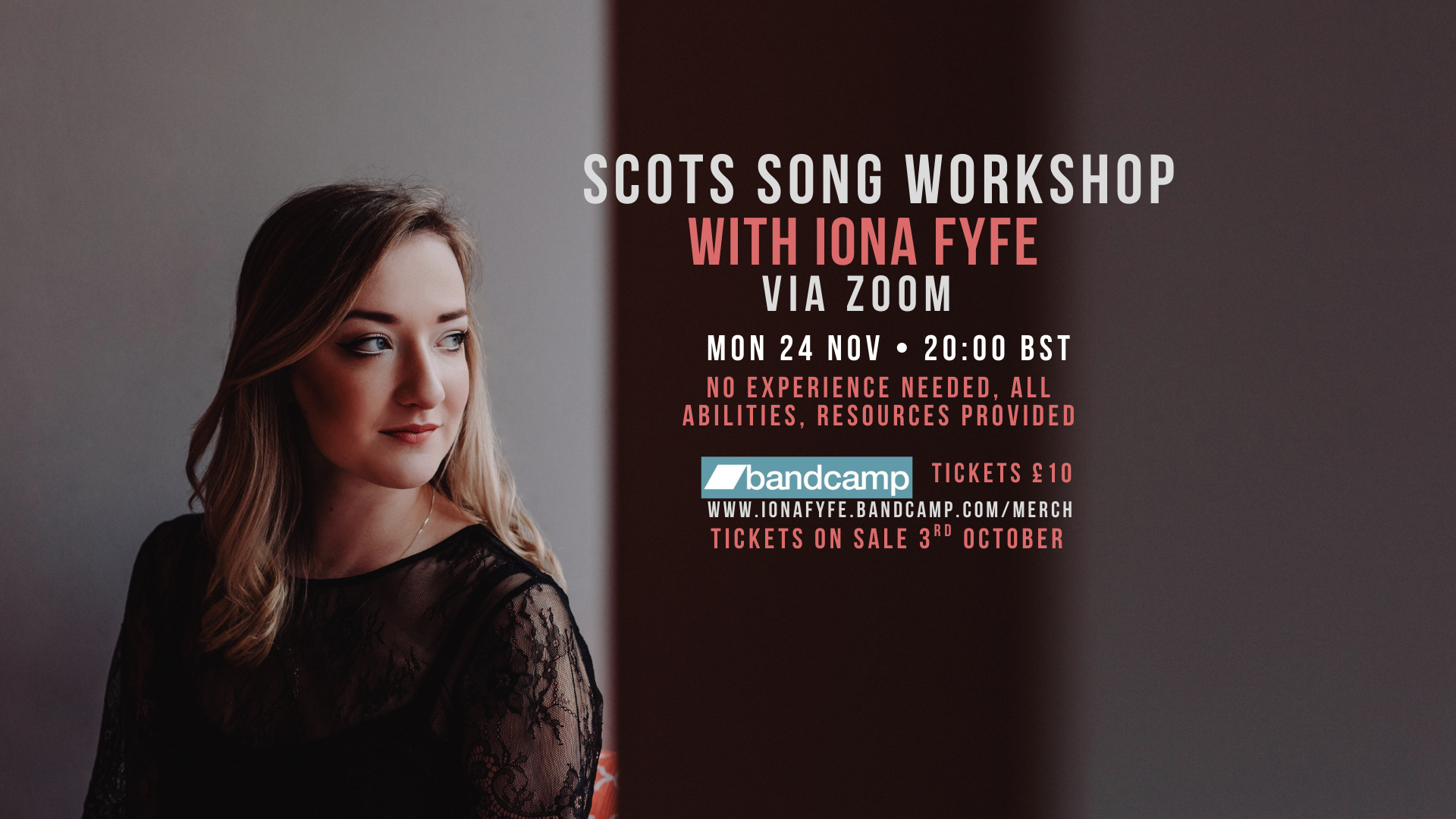 After September’s successful workshop, award-winning Scottish singer Iona Fyfe will be hosting an online Scots Song Workshop on 24th November at 20:00 BST. The workshop is open to people of all ages and abilities from all over the world. No fluency in Scots is required and all resources will be sent to you.