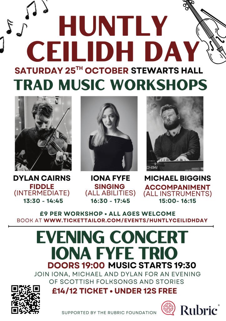 Join us for the second Huntly Ceilidh Day at The Stewarts Hall in Huntly. Trad Music Workshops in the daytime and an evening concert from Iona Fyfe Trio. All ages and abilities welcome. RSVP to the Facebook event here: https://fb.me/e/3hhxZAlHk